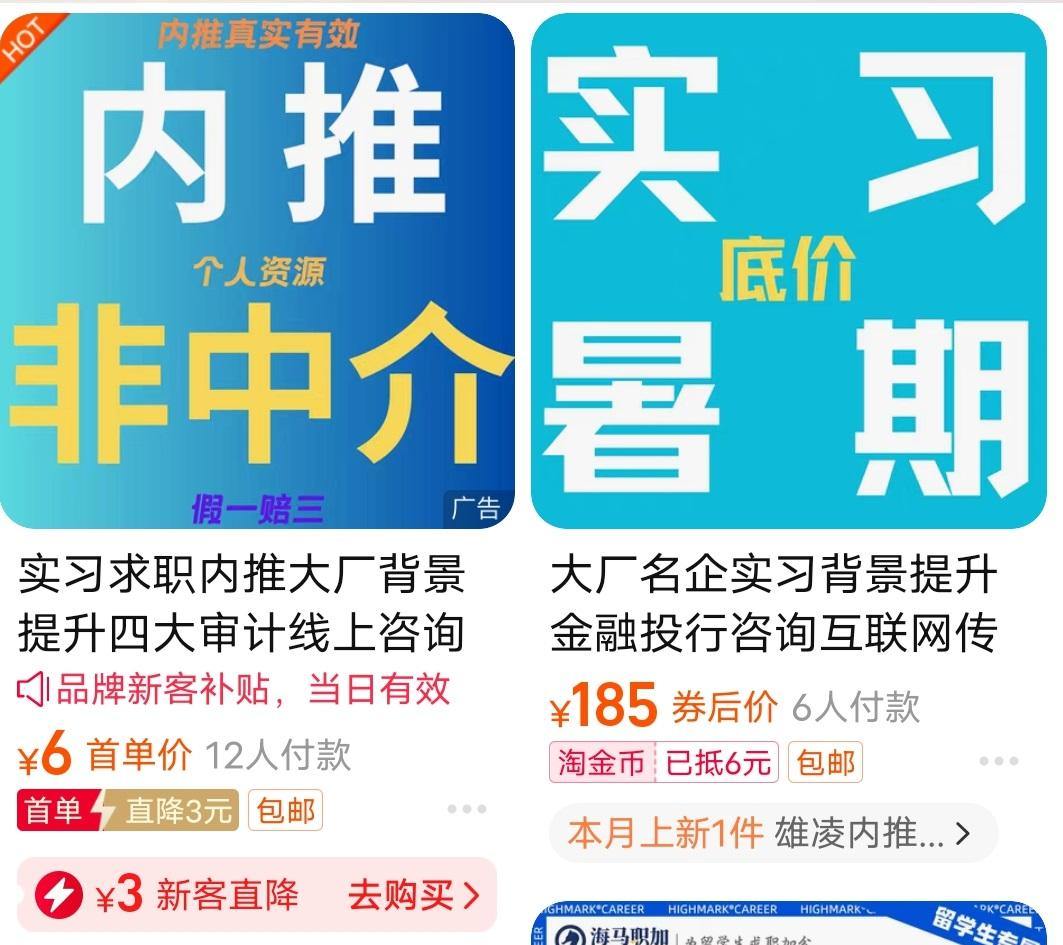 互联网大厂内推、没拿offer不收钱、保录取……眼下,内推的实习机会正被明码标价,在各大电商和社交平台成为一种商品,被炒到数千元到数万元不等。