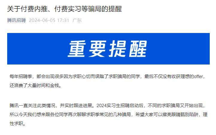 “我们不断发现有非法求职机构/求职类公众号/个人发布付费实习的相关信息,号称只要支付中介费就可以拥有一段实习经历,但实际上这类岗位都是虚假岗位,同学们获得的所谓实习证明也是虚假证明,甚至证明上加盖的印章都是伪造的。”今年6月5日,腾讯集团发文提醒,并强调,“腾讯的所有实习岗位均不存在收费的情况,并且对此类行为严令禁止,所有付费才能实习的岗位均为虚假岗位,属于诈骗信息。”