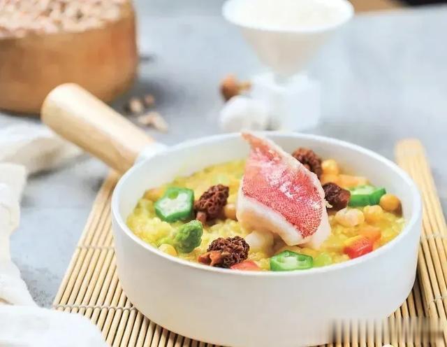 东星斑1条(约500克) 白豌豆50克大米30克羊肚菌10克泡菜15克蒜苗5克秋葵10克盐1克浓汤50毫升豆汤300克