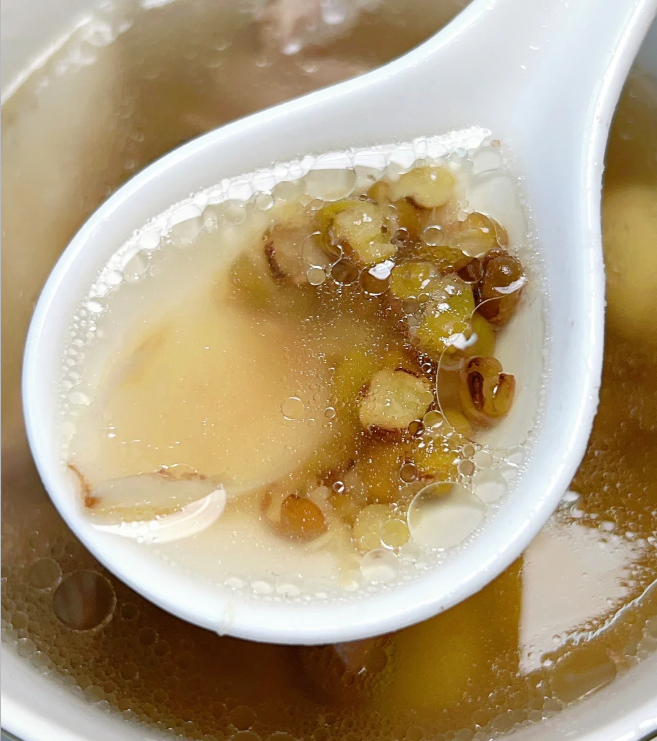 这汤一端上桌,那香味就扑鼻而来。汤色乳白,上面还漂着一些绿豆和百合,看着就特别有食欲。先喝上一口汤,哇,口感醇厚,带着猪骨的鲜香和绿豆的清爽,还有山药的绵软口感,简直绝了。再吃一块猪骨,骨髓都炖出来了,吸上一口,满满的幸福感。绿豆煮得软烂,莲子粉糯,百合清甜,每一口都让人陶醉。