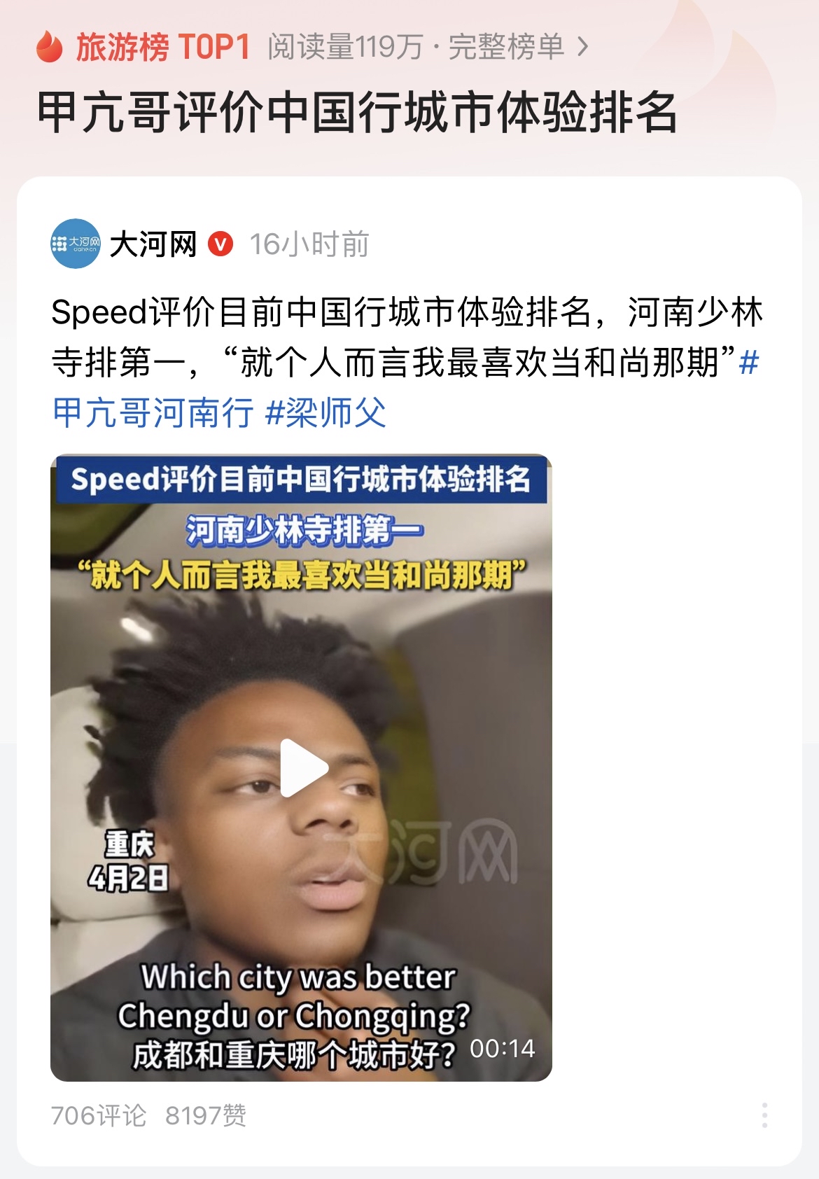 甲亢哥2025年3月21宣布开启中国之旅,并同时入住国内抖音平台,Speed首次踏上中国土地,开启上海、北京、河南、成都、重庆等多地行程。
