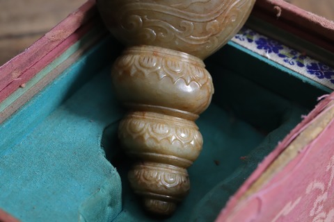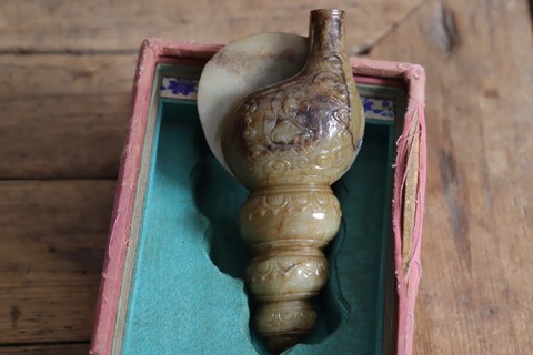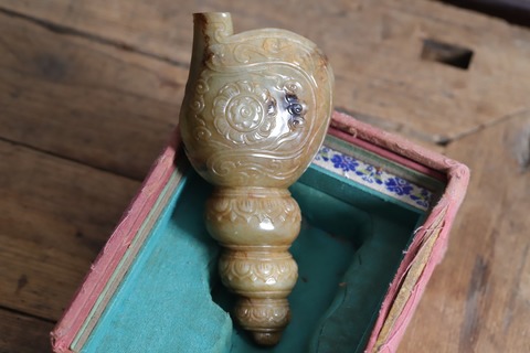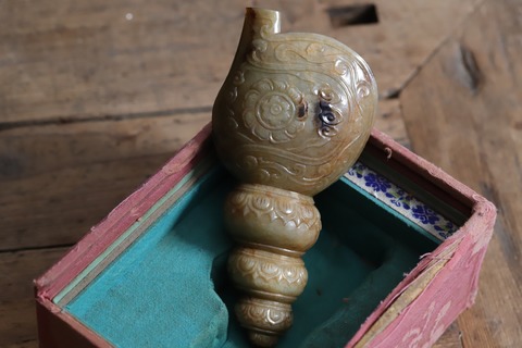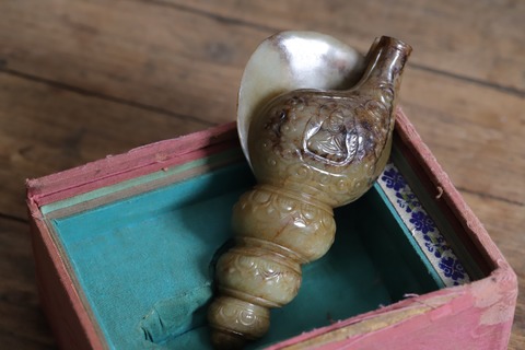 佛像法螺|挂件 ————————— 高16 厚度4 宽7.8公分 重358克 玉质温润,器形精巧,包浆醇厚,圆雕海螺,对比分明,中间一佛像,边饰以祥云纹,可作为文房案头之用,兼具观赏与实用价值