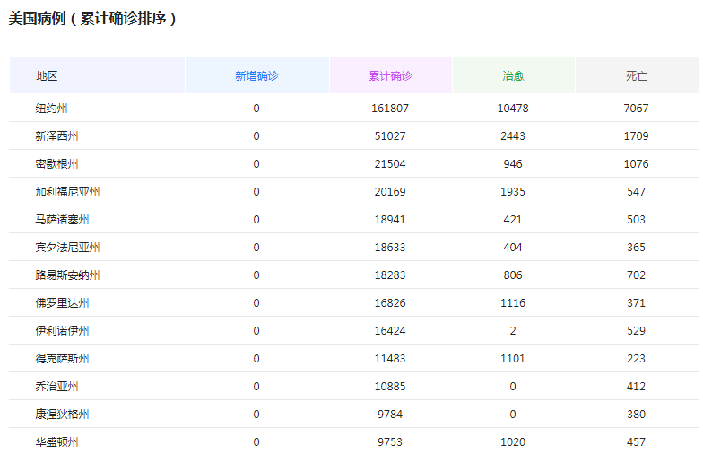 根据美国数据分析,纽约、新泽西州的疫情是最严重的,确诊人数也是最多的。数据显示,纽约累积确诊17万4481人,其中7067例死亡,新泽西州累积确诊5万4588例,其中1932人死亡;但是美国其他州的疫情也是相当严峻的,形式仍旧不容乐观‘