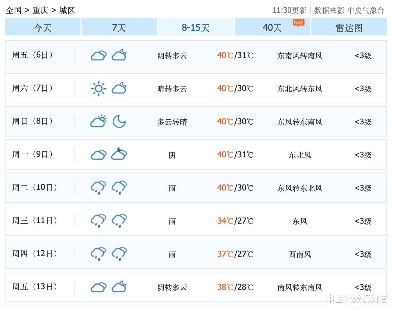 不过,好消息是,根据中央气象台的8到15天预报显示,9月上旬40度以上的高温天气虽然还会出现,但9月11日前后重庆有望迎来一场降雨。这场雨或许会让酷热的天气暂时消退,高温可能会在9月中旬前期有所缓解。