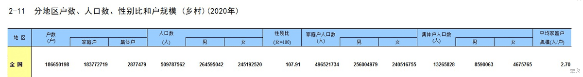 以2021年全国人口普查数据为例,男女比例为105.07:100,全国镇人口性别比为103.28,全国乡村人口性别比为107.9。