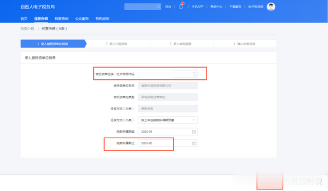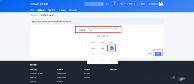 2.进入“经营所得(A表)”页面后,点击【申报年度】,选择“2025年”点击【确定】;输入申报个体工商户统一社会信用代码,选择对应商户,选择【税款所属期止】,点击【下一步】。