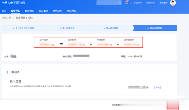 5.点击【提交】,完成经营所得(A表)季度预缴申报。如需要缴纳税款,点击【立即缴税】,选择支付方式进行缴纳税款,完成经营所得(A)表申报。
