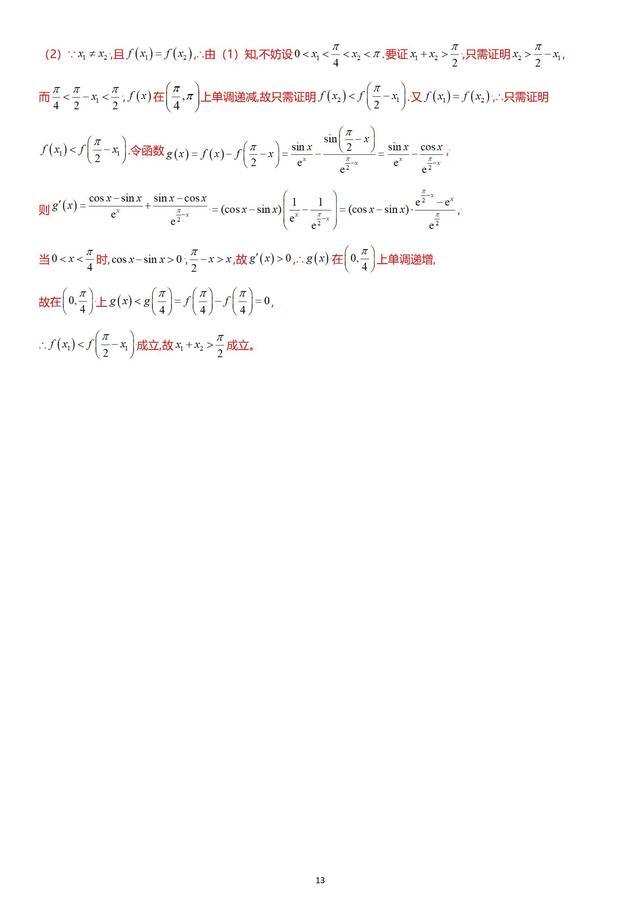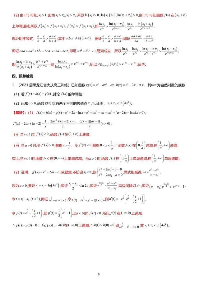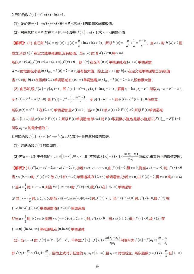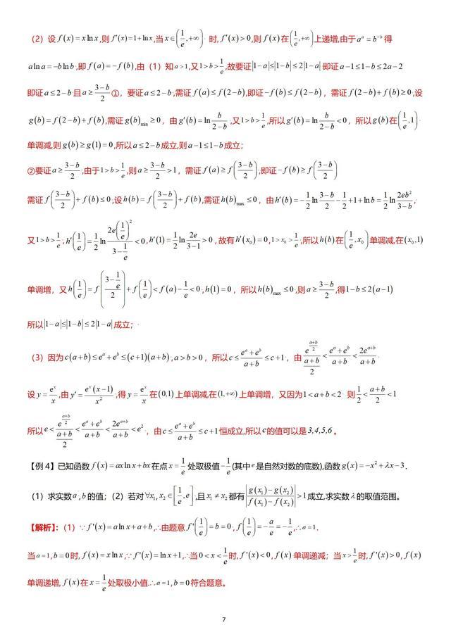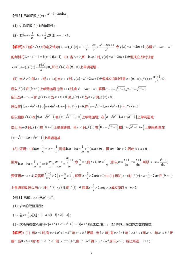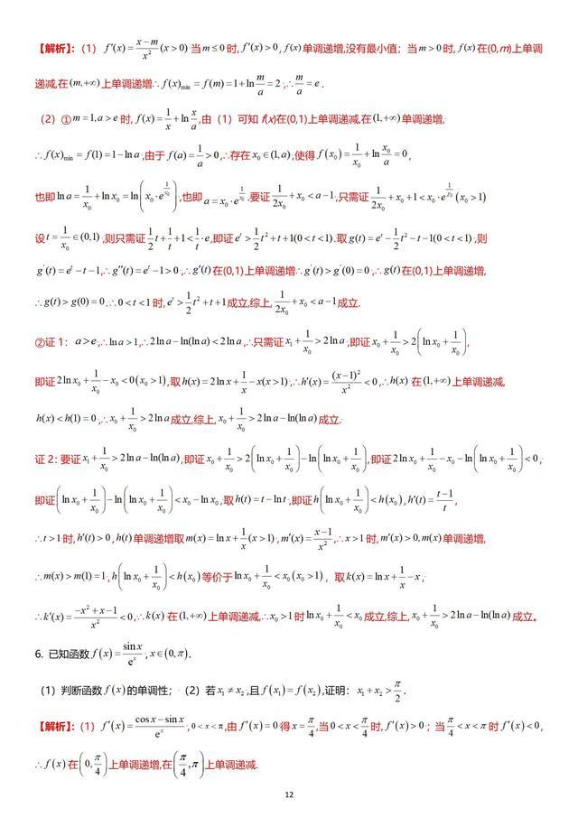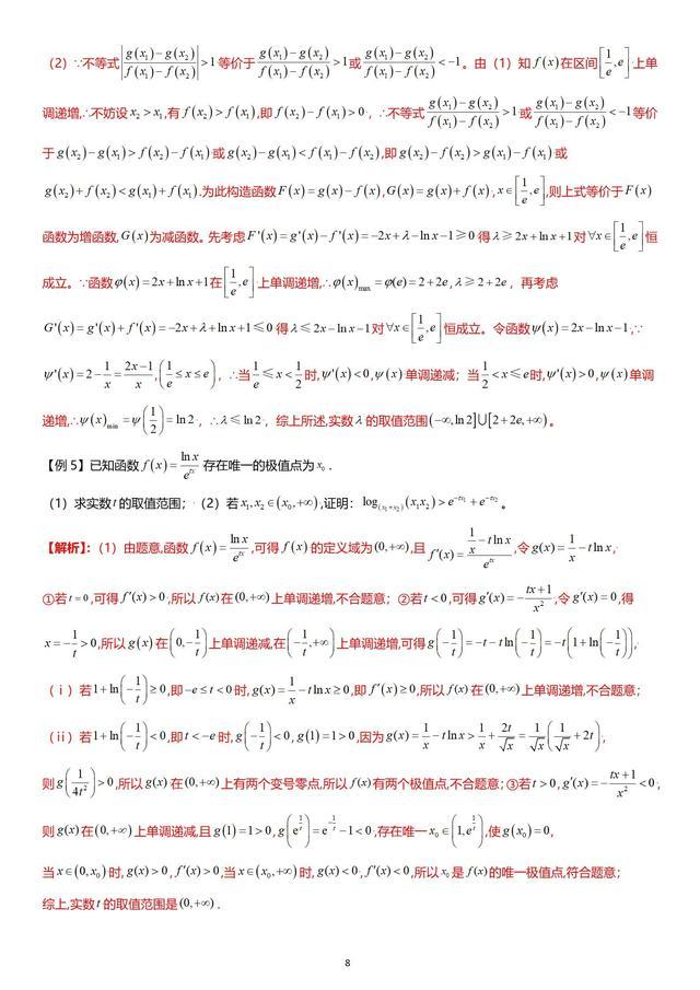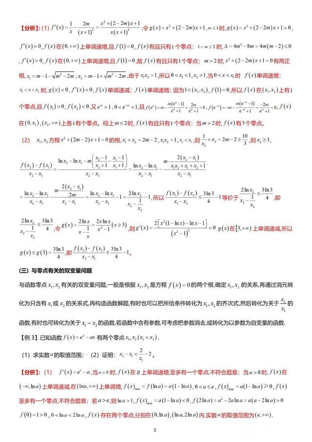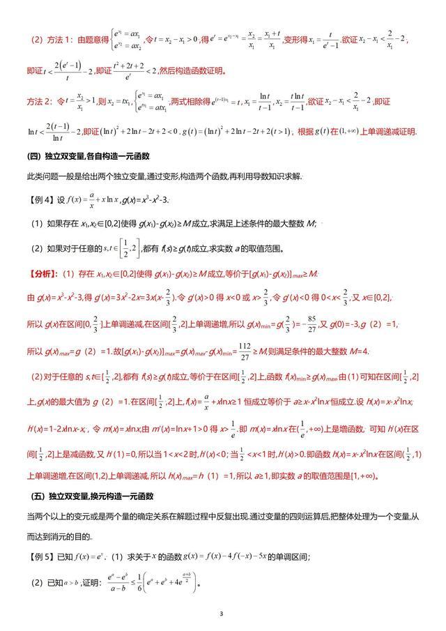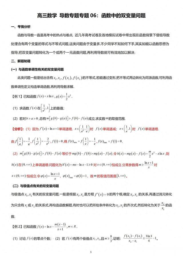 一、考情分析 函数与导数一直是高考中的热点与难点, 近几年高考试卷及各地模拟试卷中常出现在函数背景下借组导数处理含有两个变量的等式与不等式问题,这类问题由于变量多,不少同学不知如何下手,其实如能以函数思想为指导,把双变量问题转化为一个或两个一元函数问题,再利用导数就可有效地加以解决。 二、解题秘籍 1、与函数单调性有关的双变量问题 。2、与极值点有关的双变量问题 。3、与零点有关的双变量问题 。4、独立双变量,各自构造一元函数 此类问题一般是给出两个独立变量,通过变形,构造两个函数,再利用导数知识求解。5、独立双变量,换元构造一元函数 当两个以上的变元或是两个量的确定关系在解题过程中反复出现.通过变量的四则运算后,把整体处理为一个变量,从而达到消元的目的。6、独立双变量,把其中一个变量看作常数 若问题中两个变量没有明确的数量等式关系,有时可以把其中一个当常数,另外一个当自变量。7、独立双变量,通过放缩消元转化为单变量问题 此类问题一般是把其中一个变量的式子放缩成常数,从而把双变量问题转化为单变量问题。