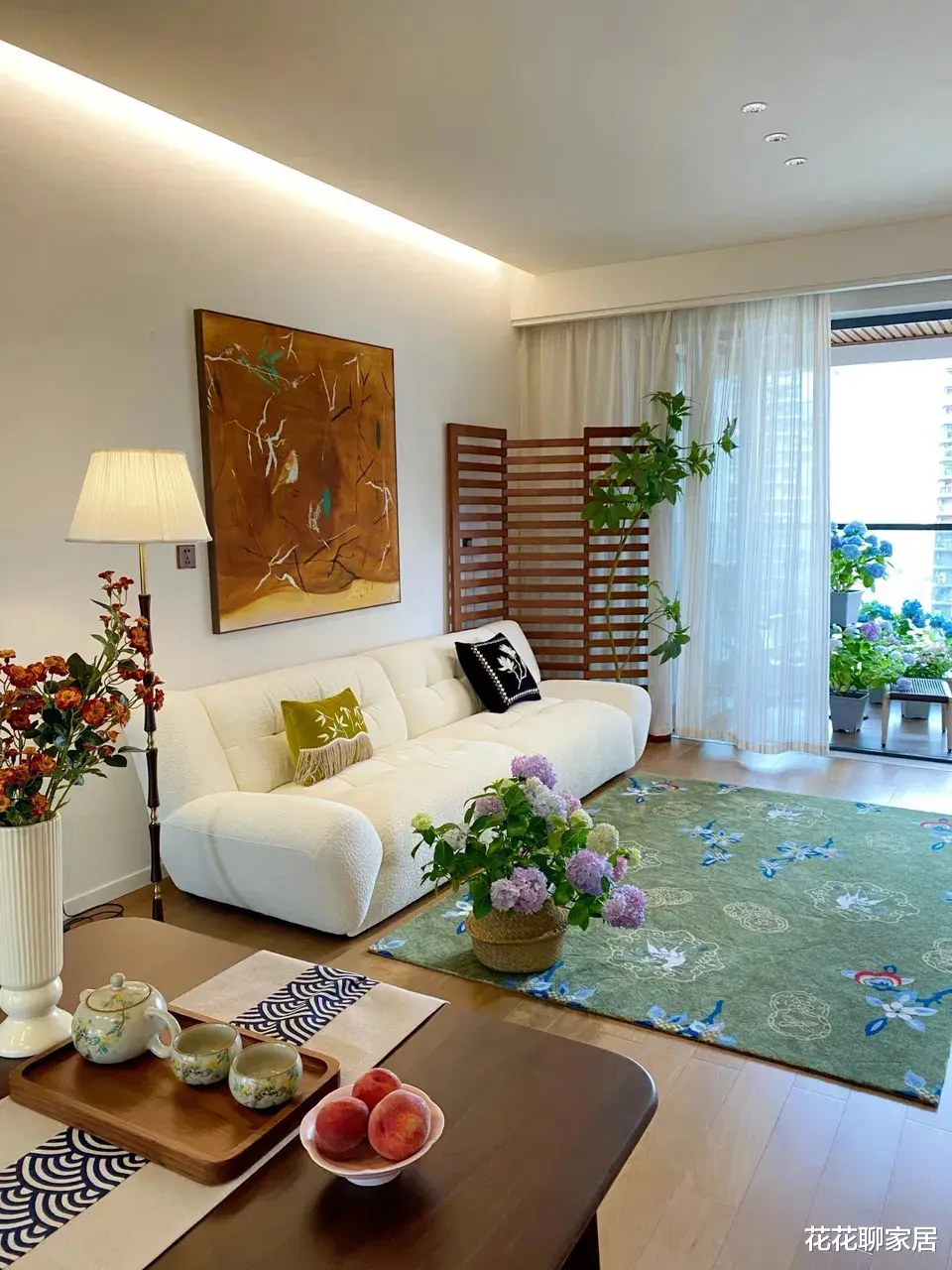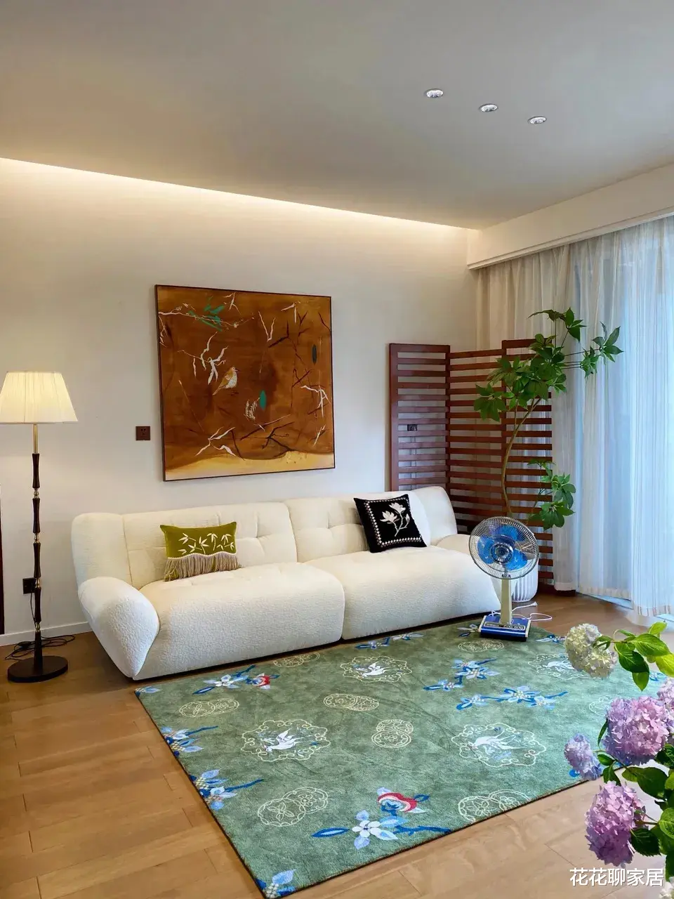 客厅地面上铺陈的地毯以淡雅的绿色为底色,其上点缀着蓝色和白色的花卉图案,整体风格流露出浓郁的东方韵味。