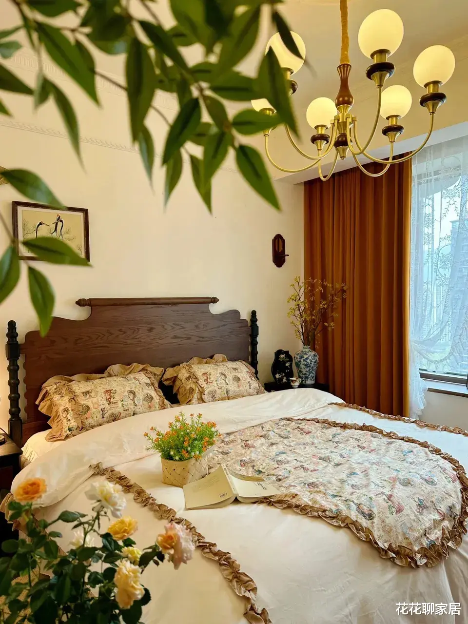 卧室里的床铺被褥以温和的米白色为主色,边缘装饰着浅棕色的荷叶边,这种设计不仅为床品增加了一份柔和的触感,也赋予了床铺更加丰富的视觉层次。