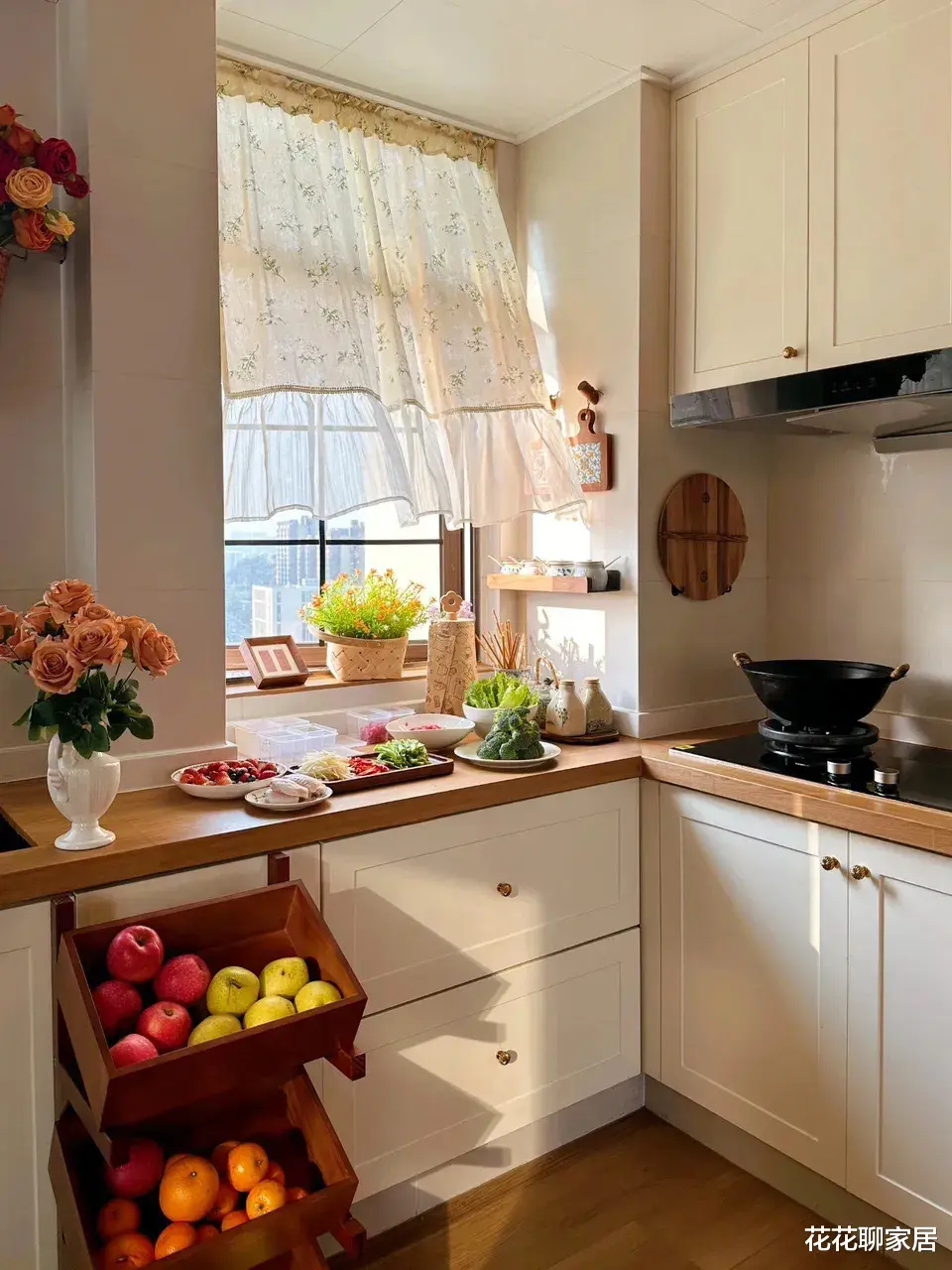 厨房内的橱柜以柔和的奶油白色为主色调,门板设计简约而精致,装饰着小巧的圆形铜质把手,增添了一抹细节之美。
