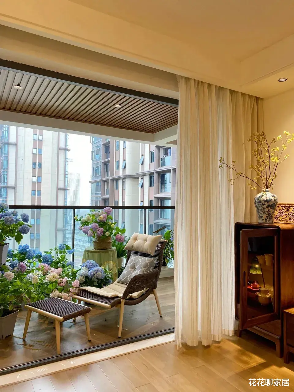 在阳台区域,精心摆放了几盆生机勃勃的绿色植物,它们枝叶茂盛、形态各异,为室内空间注入了自然的韵味。