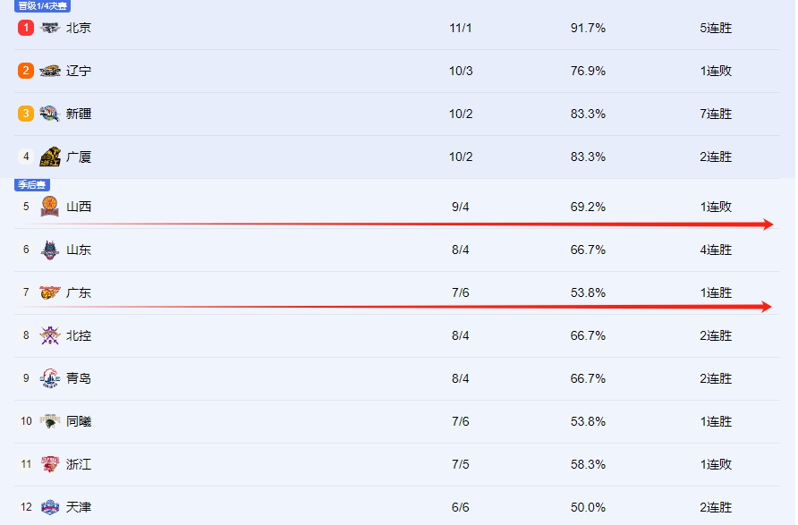 比赛结束后,广东男篮排名从第十升至第七,山西男篮也跌落至第五。我个人觉得,本场比赛的胜利对于广东男篮而言太重要了。不过绝杀不会每场比赛都有,通过比赛内容也能看出,广东男篮仍然需要对阵容进行调整,我觉得阿姆斯持球造杀伤的能力还是不够,广东男篮需要古德温这样有冲击力的外援。这个非常关键,也是减轻徐杰和胡明轩负担和伤病因素的关键,所以接下来就要看朱芳雨怎么去补强第四外援了。