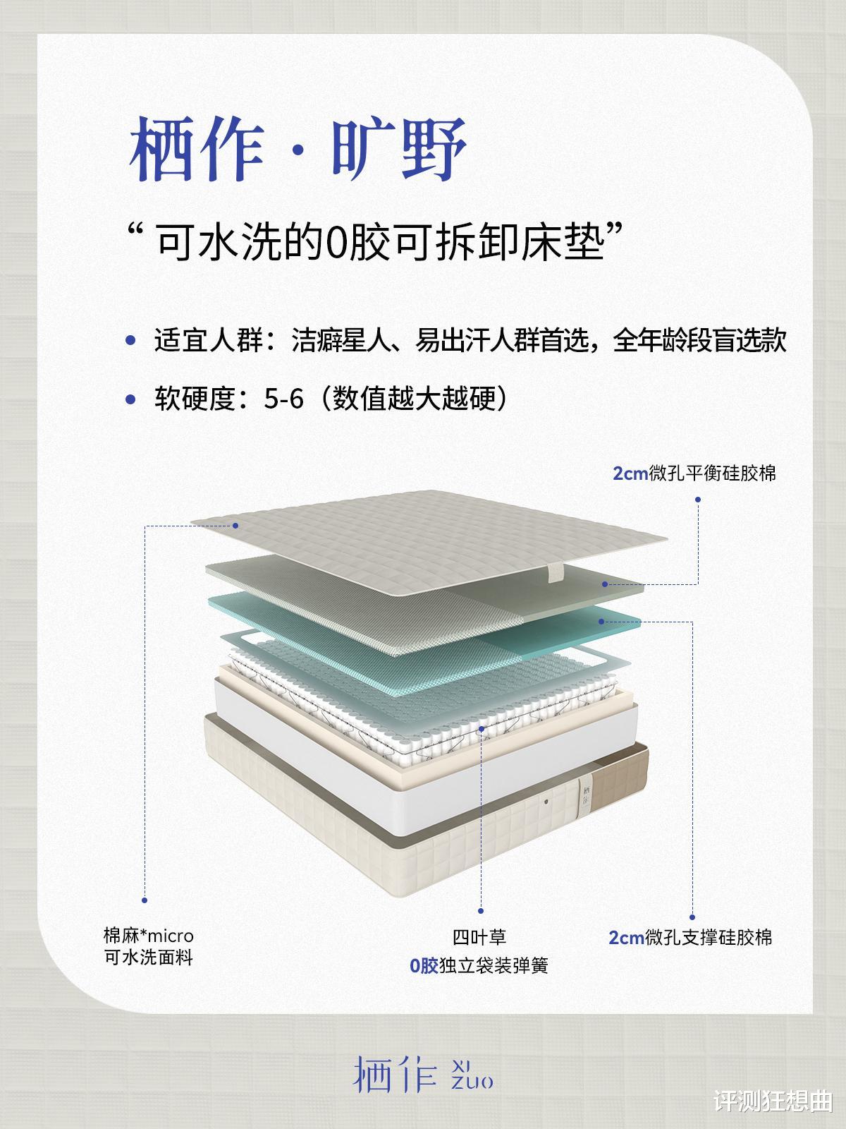 ● 产品特点:栖作旷野系列床垫以0胶水环保设计著称,面料和填充层均可拆卸水洗,透气性极佳,同时提供可调节的舒适层,适中和适中偏硬的睡感可满足不同需求,是注重环保和多功能性的理想选择。