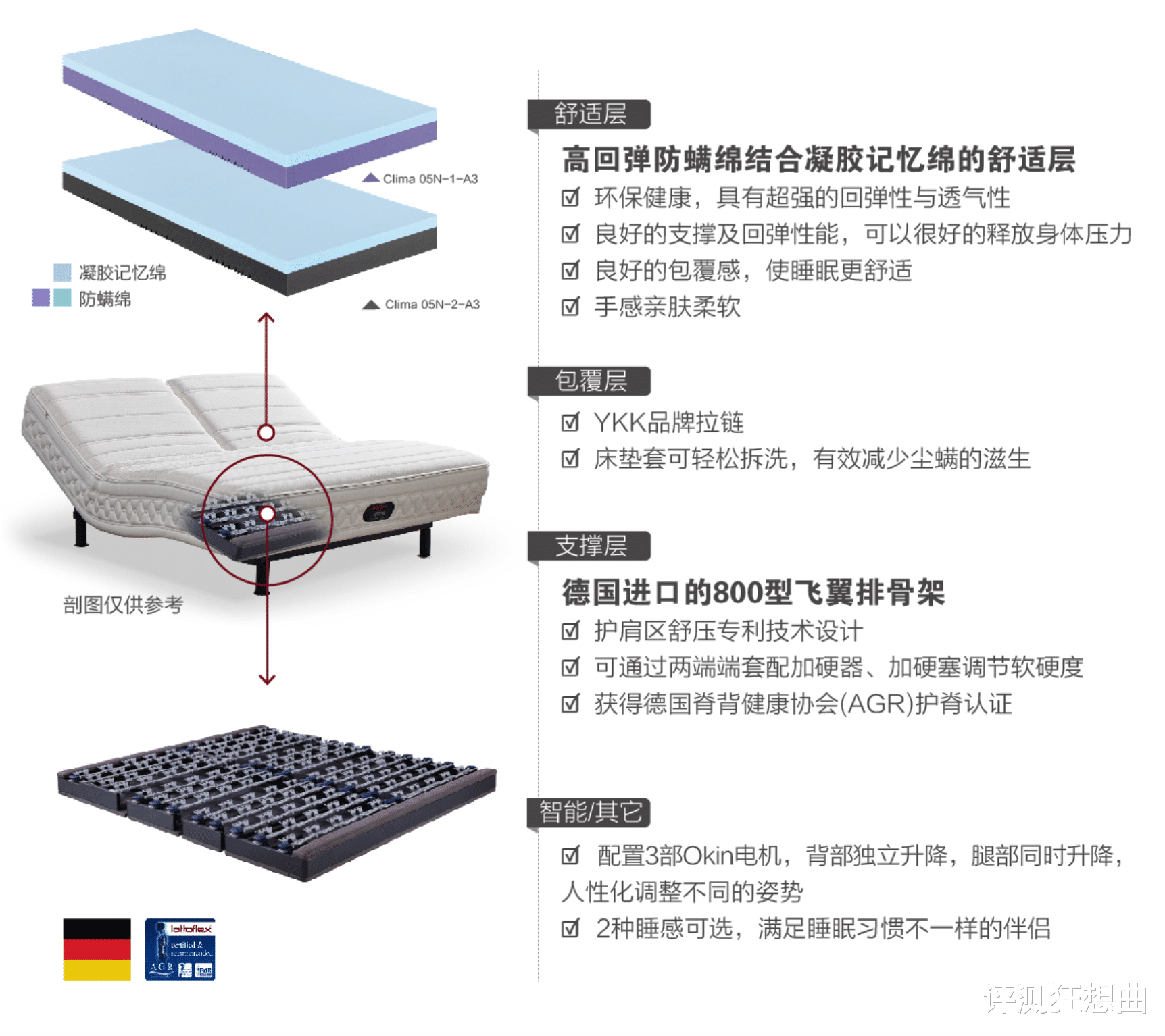 ● 舒适性:马可波罗的舒适层设计比较简洁,硬度适中,适合喜欢中等硬度床垫的用户。无论是仰卧还是侧卧,床垫都能提供较为均衡的舒适体验。配备可升降的电动床架,可以通过遥控器或APP进行调节,满足不同睡姿需求。