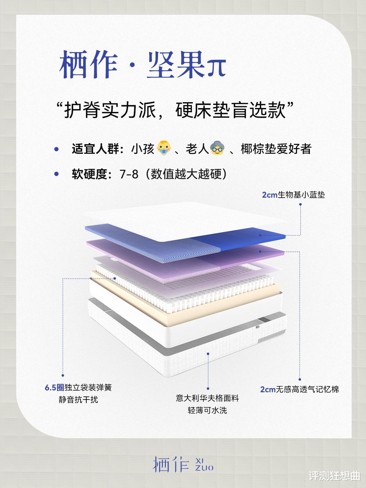 ● 产品特点:栖作坚果派系列是栖作品牌中支撑力较强的代表,采用全拆卸设计,可以方便的进行模块化定制,填充可按需替换,能够快速找到适合自己睡感需求的配置。坚果派本身睡感偏硬、透气不错,特别适合大体重、老人和儿童使用,提供稳固且持久的支撑。