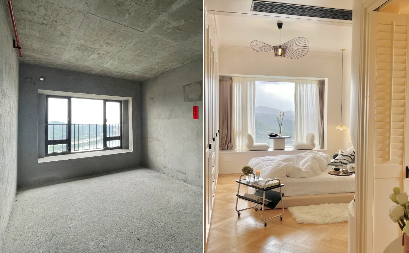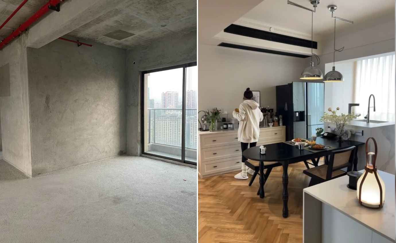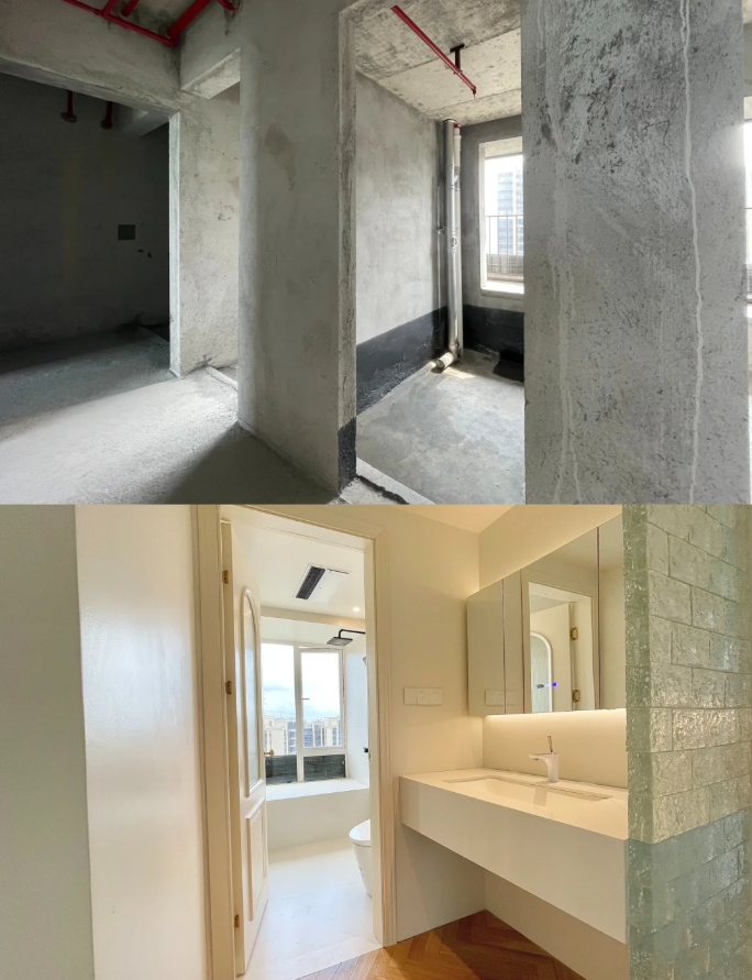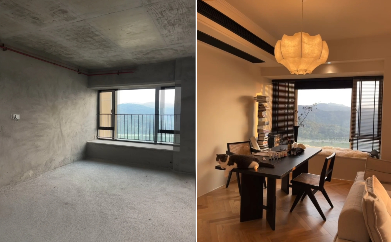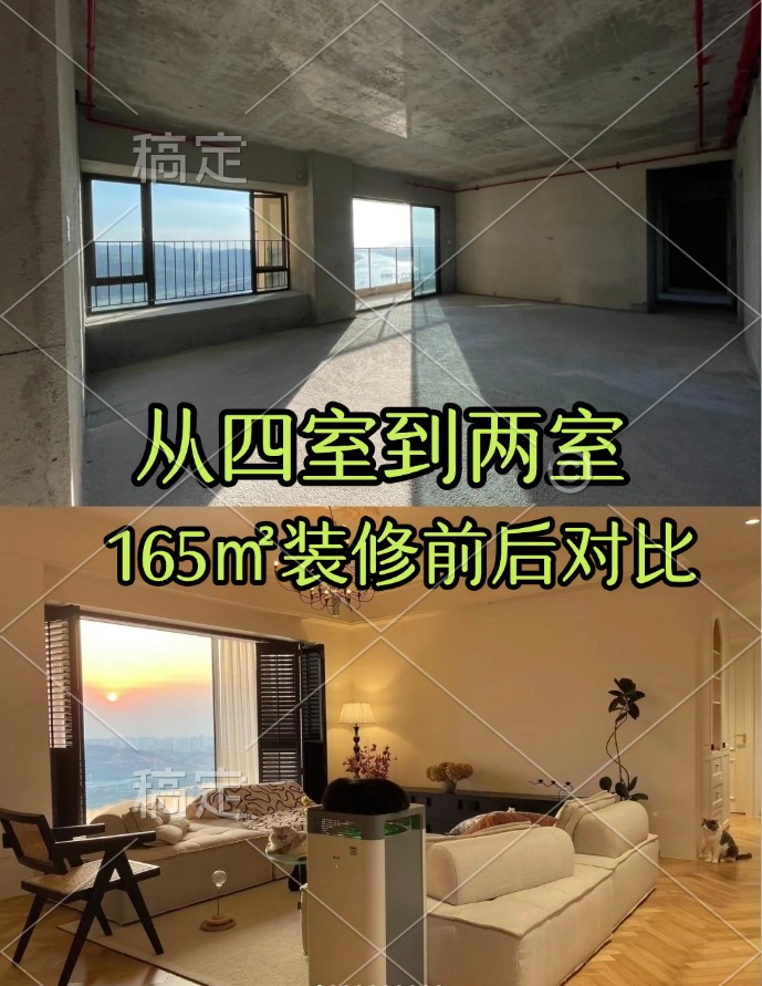 -🧩户型:4室2厅2卫,横厅格局;改造以后,2个卧室+一个猫房+半开放式厨房 +带浴缸的衣帽间- 🎨Style:复古混搭- 🧩Area:165㎡- 📎Type:毛坯房装修- 💰Spend:改造费用65万-🟠配色:原木色+白色+黑色✨基本都是黑白原木,这3种主调,所以家电柜子啥的都不会太五颜六色,看起来简约又耐看;整体偏一点轻法式,搭配一些黑色元素点缀✨软装基本按照可移动的来搭配,主打一个舒适可变换的家✨全屋铺了人字拼木地板,大面积刷了漆。 敲掉一个阳光房,做衣帽间~ 也敲掉一面墙,设计了半开放式厨房✨岛台一体的餐桌,模块沙发,可移动壁炉,移动电视支架,主打一个随时改变格局,两个人怎么舒服怎么来