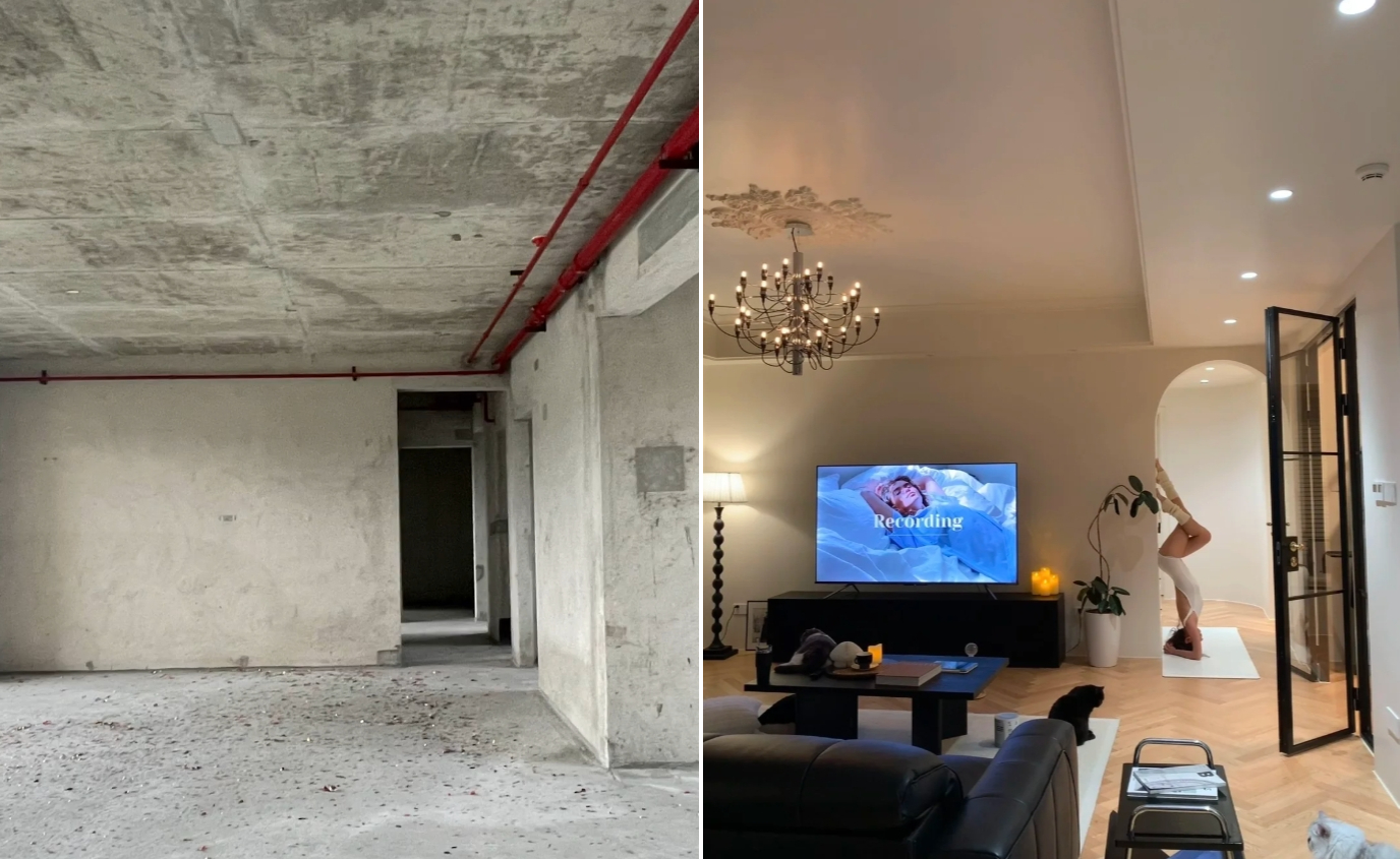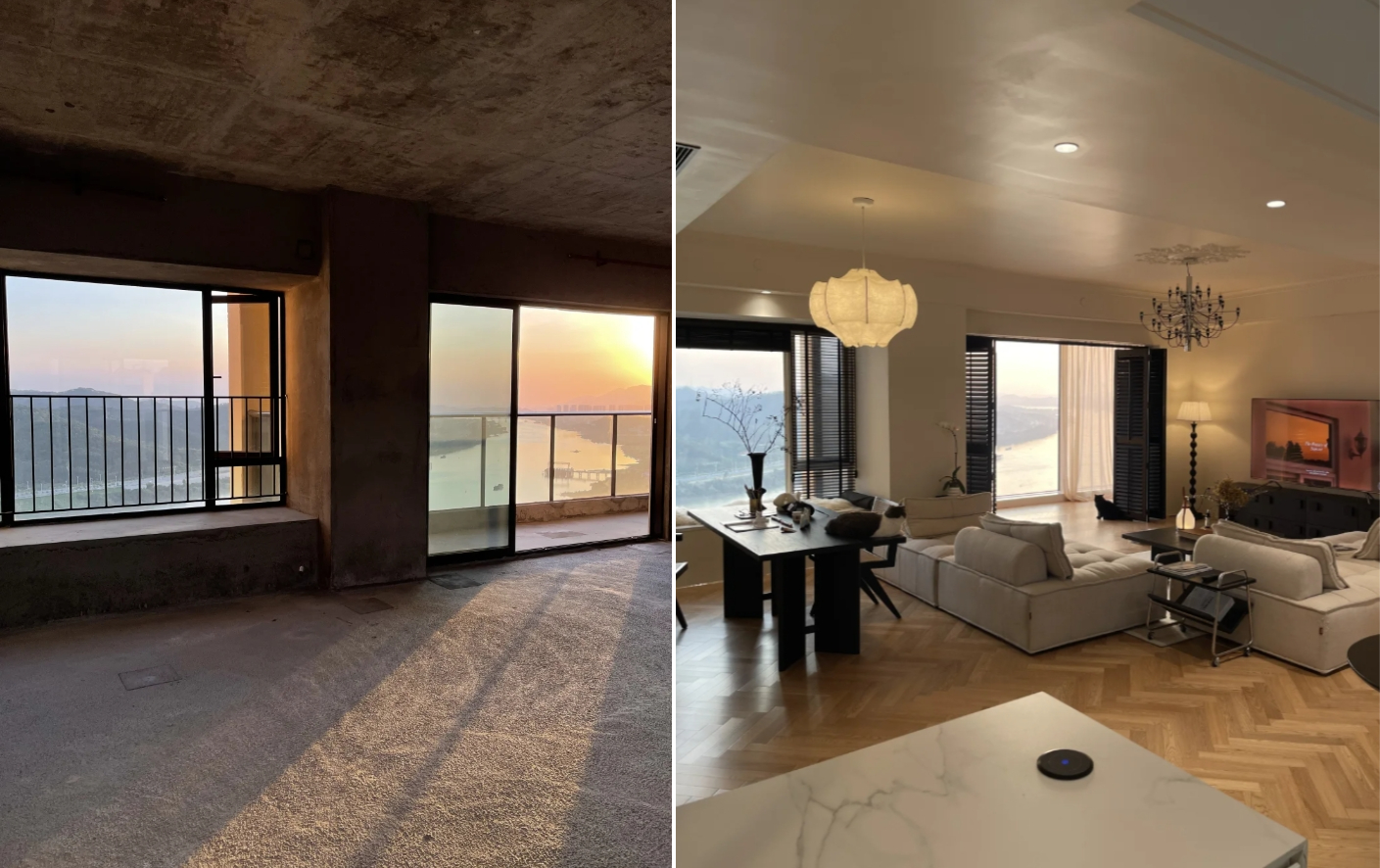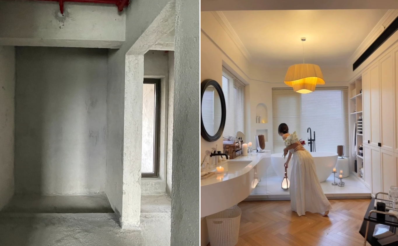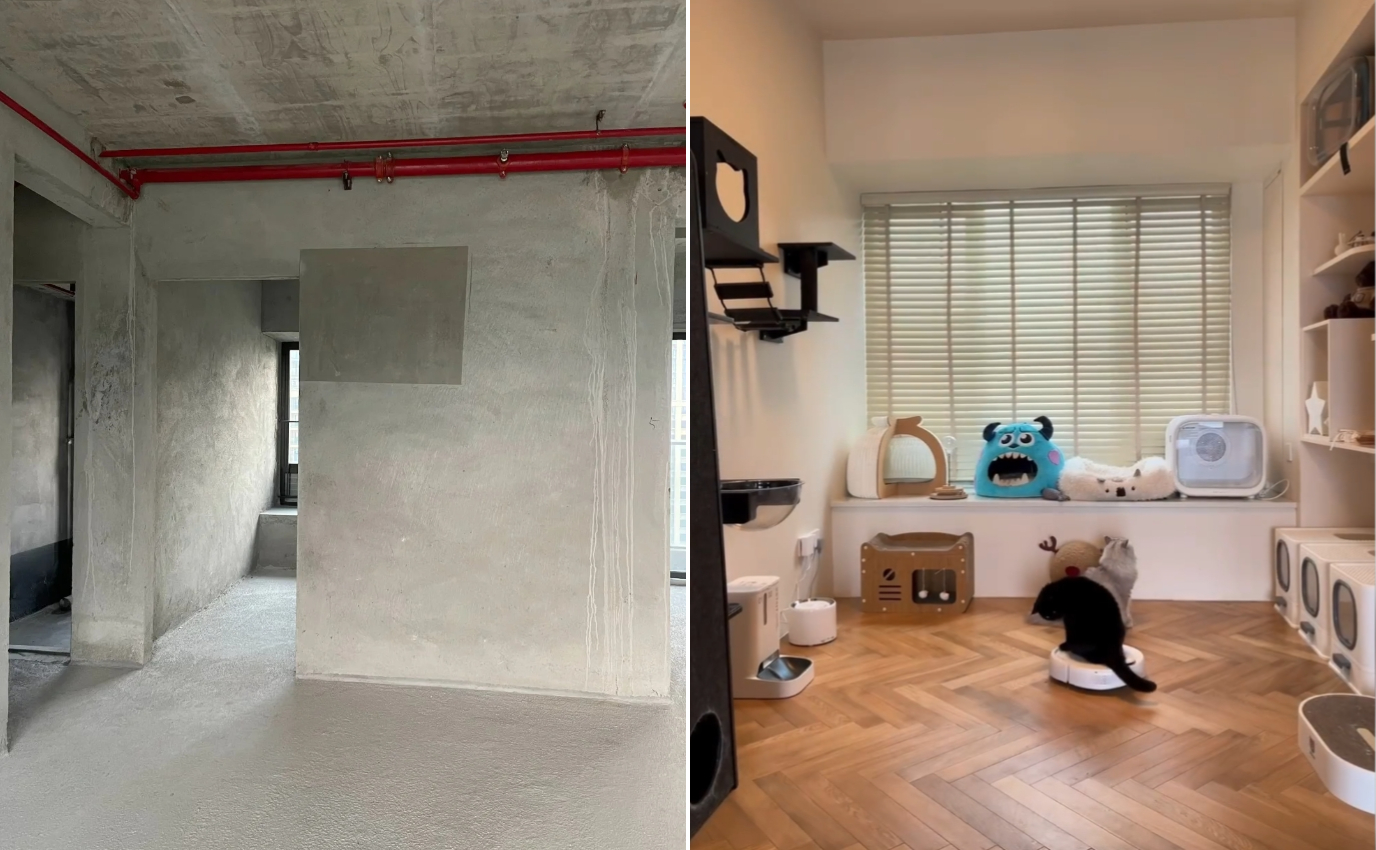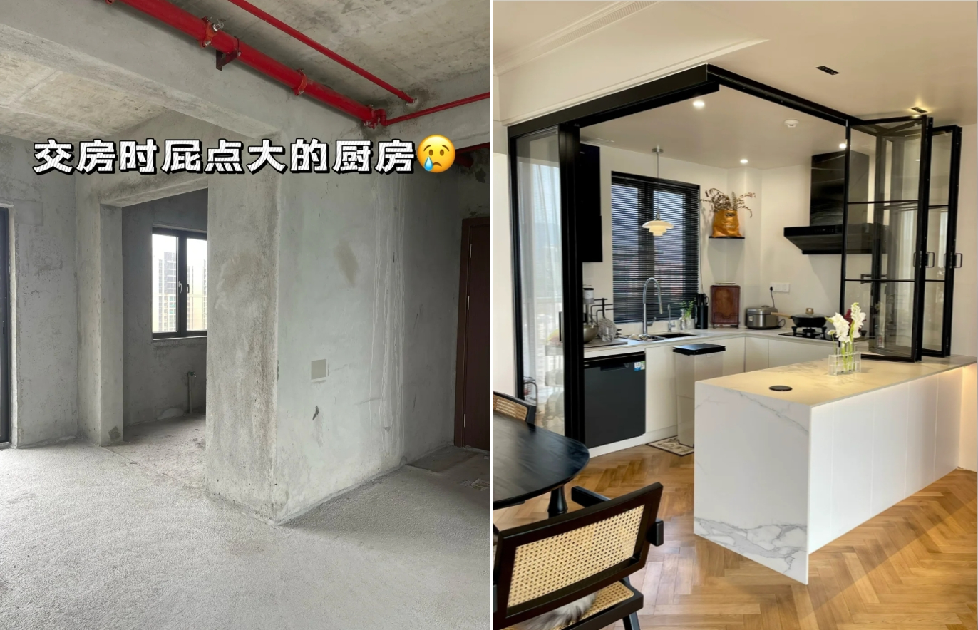 -🧩户型:4室2厅2卫,横厅格局;改造以后,2个卧室+一个猫房+半开放式厨房 +带浴缸的衣帽间- 🎨Style:复古混搭- 🧩Area:165㎡- 📎Type:毛坯房装修- 💰Spend:改造费用65万-🟠配色:原木色+白色+黑色✨基本都是黑白原木,这3种主调,所以家电柜子啥的都不会太五颜六色,看起来简约又耐看;整体偏一点轻法式,搭配一些黑色元素点缀✨软装基本按照可移动的来搭配,主打一个舒适可变换的家✨全屋铺了人字拼木地板,大面积刷了漆。 敲掉一个阳光房,做衣帽间~ 也敲掉一面墙,设计了半开放式厨房✨岛台一体的餐桌,模块沙发,可移动壁炉,移动电视支架,主打一个随时改变格局,两个人怎么舒服怎么来
