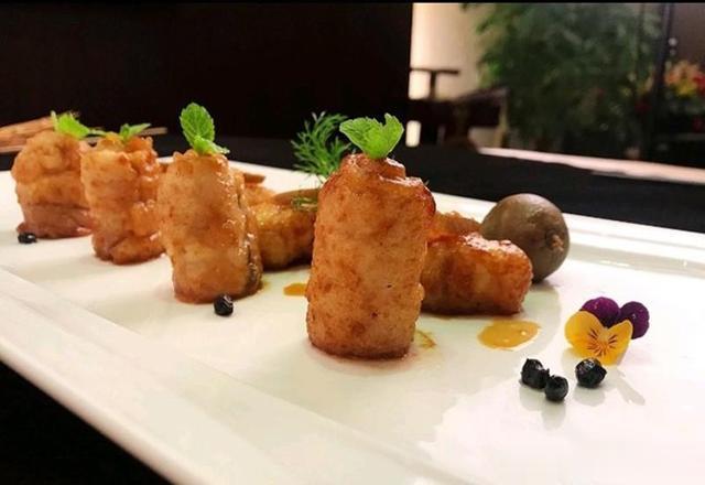 2、入味后去腥的带鱼取出吸水拍干粉卷好,入油锅炸制定型。