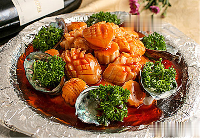 西兰花12个(围边),青红美人椒20克,小米辣5克,姜粒、蒜粒各5克,鲍鱼壳12个。
