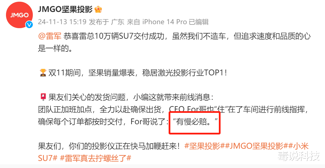 这样的“蹭热度”,并非简单的跟风或炒作,而是一种基于产品品质和用户体验的深度营销。坚果投影通过这一举动,不仅成功提升了品牌形象,更让消费者对其产品的品质和服务产生了更高的期待。之所以这样说,从坚果双十一的销量就能够感受到。在过去的双十一,坚果N3系列投影再度销量爆表,实现了多个平台的销量TOP1。为此,坚果CEO For哥才会进工厂监工,确保用户购买的投影仪能够及时的送到用户手中,For哥还承诺,有慢必赔!直接提升了用户的购买体验。