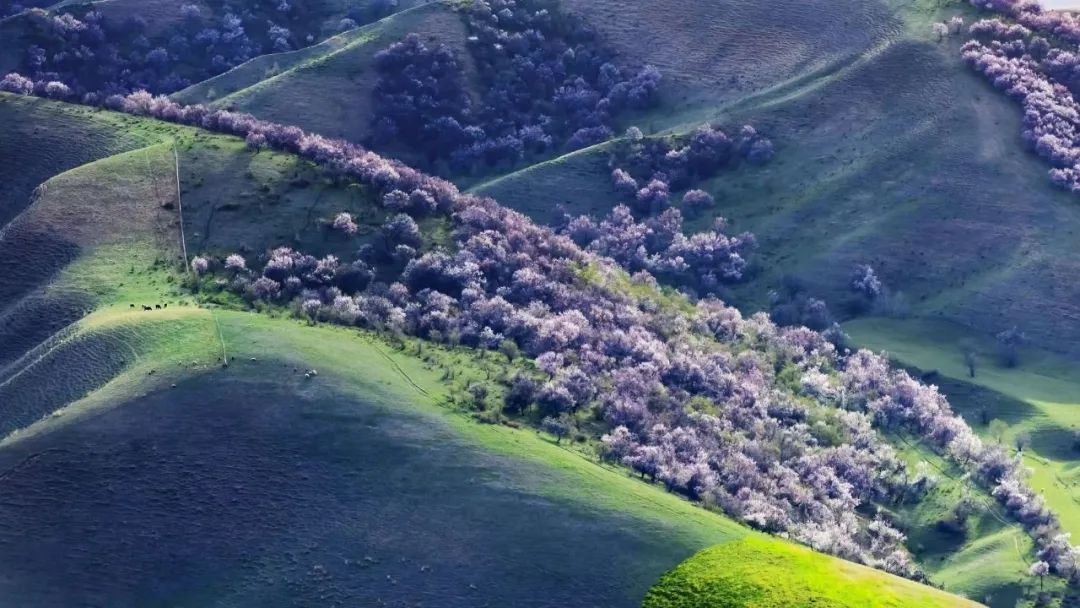 漫山遍野的野杏树,枝干虬曲苍劲,粉白的杏花密密匝匝地绽放在枝头,与嫩绿的草地、澄澈如宝石的蓝天交相辉映。