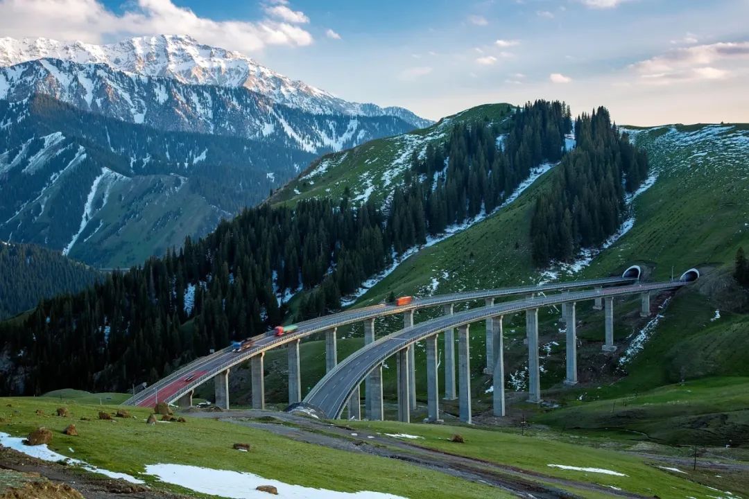 初春时节,果子沟两岸的山峦在春风的吹拂下,渐渐染上了一层新绿。果子沟大桥宛如一条巨龙,横卧在山间,与周围的自然景观相得益彰。