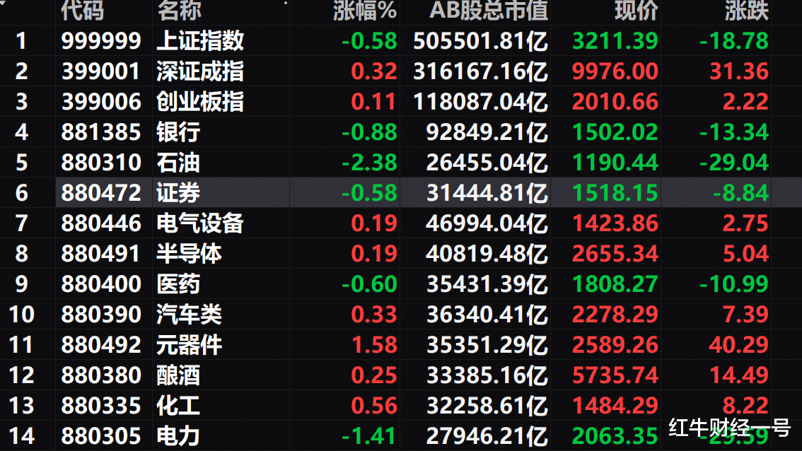三、今天沪指走势为何明显弱于深成指,根本原因是银行及石油板块走低了,跌幅分别为0.88%、2.38%,而这两个板块基本仅与沪指相关,“工农中建”四大银行及“三桶油”均在沪所,而且均以较大跌幅收盘,银行板块是A股第一大行业市值板块,从而拖累了沪指走势。