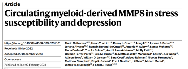 Cathomas F, Lin H Y, Chan K L, et al. Circulating myeloid-derived MMP8 in stress susceptibility and depression[J]. Nature, 2024: 1-8.