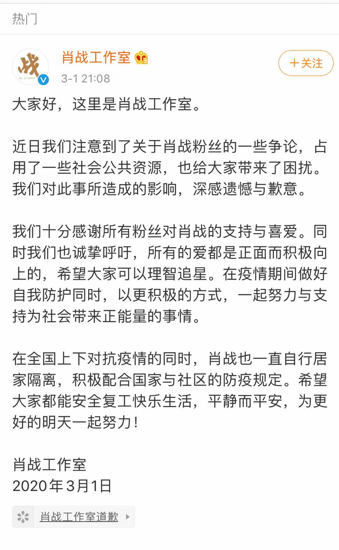 因为这件这件事情逐渐的影响,上升到国际事件,也激怒了一部分圈内粉丝以及创作者,受这次事情影响,肖战工作室出来道歉了,他的粉丝因为也力挺。道歉声明还没有发布多长时间呢.