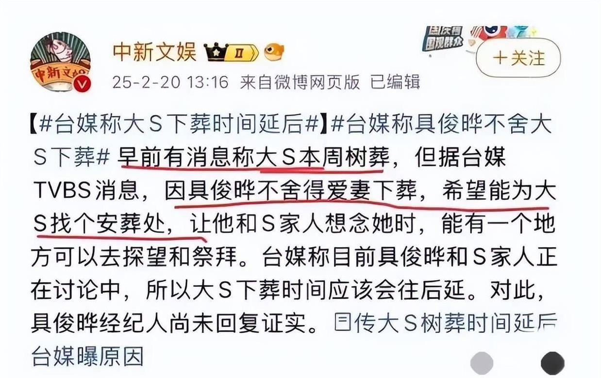 不少台媒仍在报道,大S的树葬将于本周落实。然而在临近结束之际,始终与S妈以及小S处于同一阵营的具俊晔,出人意料地站了出来。 身为大S现任丈夫的他中止了树葬安排,大S的下葬相关事宜将会推迟!
