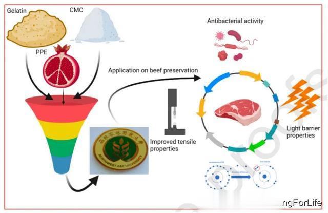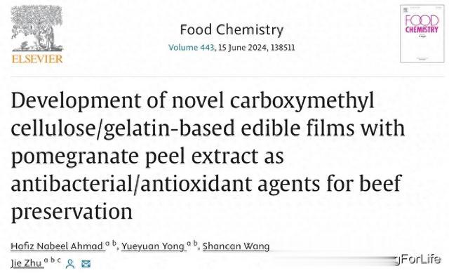 近日,来自西北农林科技大学的朱杰教授团队进行了开发基于羧甲基纤维素/明胶的新型食用薄膜,将石榴皮提取物作为牛肉防腐抗菌和抗氧化剂的相关研究。研究成果以“Development of novel carboxymethyl cellulose/gelatin-based edible films with pomegranate peel extract as antibacterial/antioxidant agents for beef preservation”为题于01月23日发表在《Food Chemistry》上。