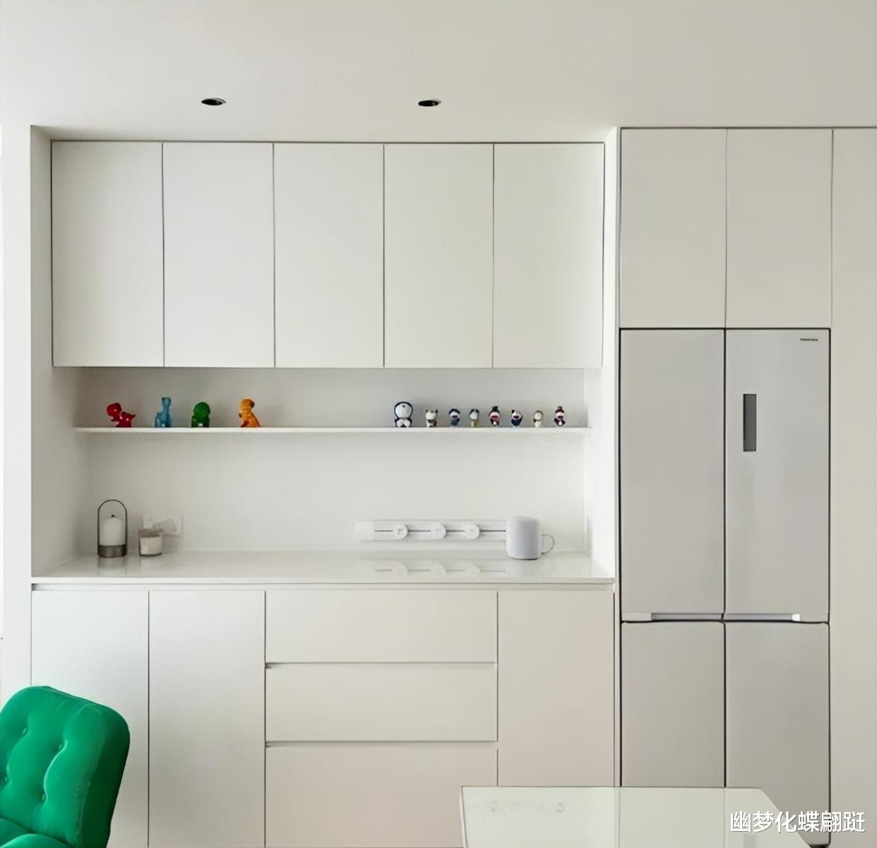 还记得我家之前的餐边柜吗?那是一个60厘米深的“大箱子”,冰箱嵌入后显得特别笨重,空间利用率也不高。但老公的设计让我眼前一亮!他在餐边柜侧面增加了一组窄柜,巧妙地嵌入冰箱,整个柜子一下子变得轻盈起来。