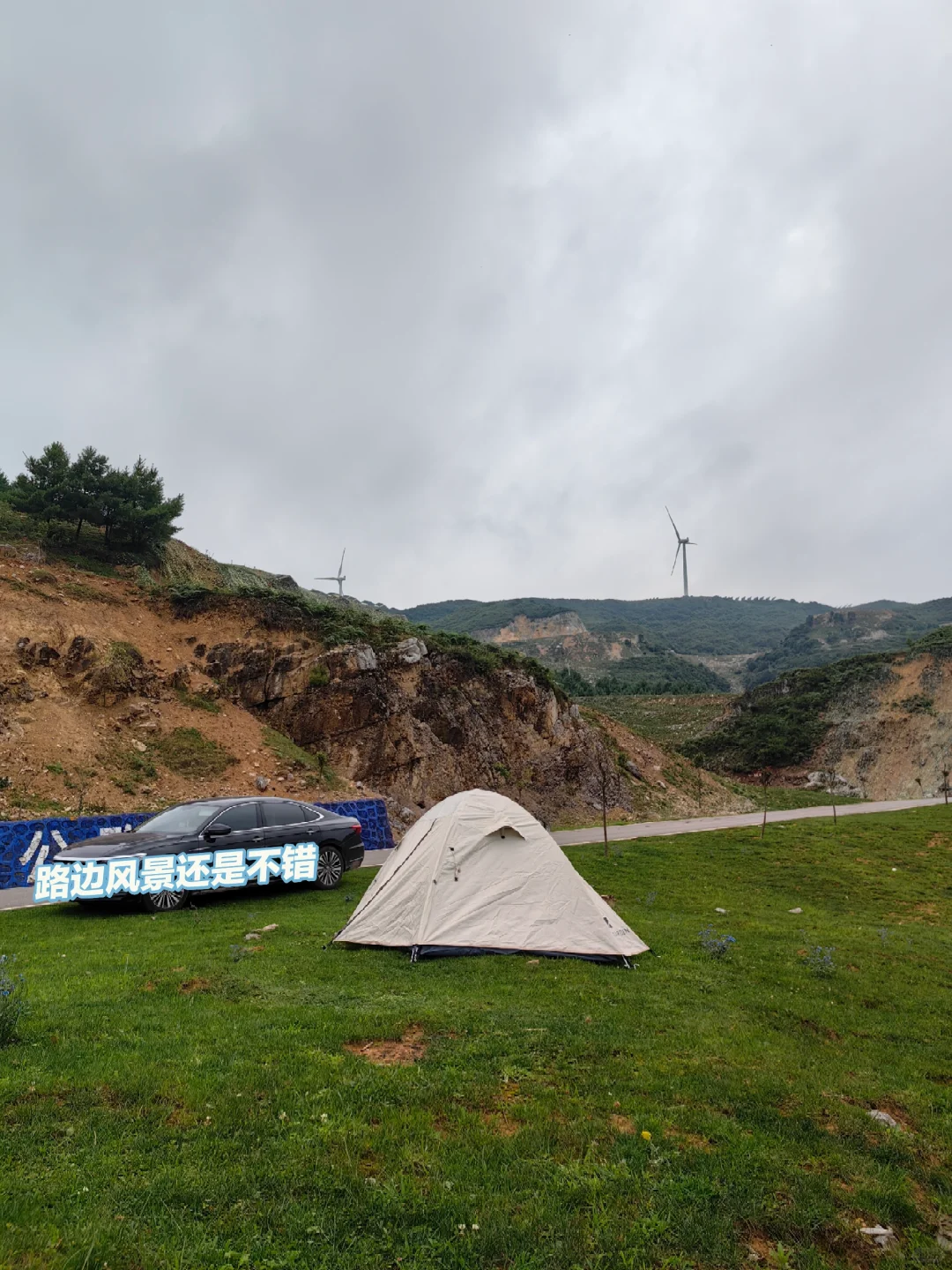 面积很大停车后沿草地爬到山顶,一览众山小,在平坦的草地露营,风很大,天幕不太行,意外发现钓伞竟然还是个不错的选择。