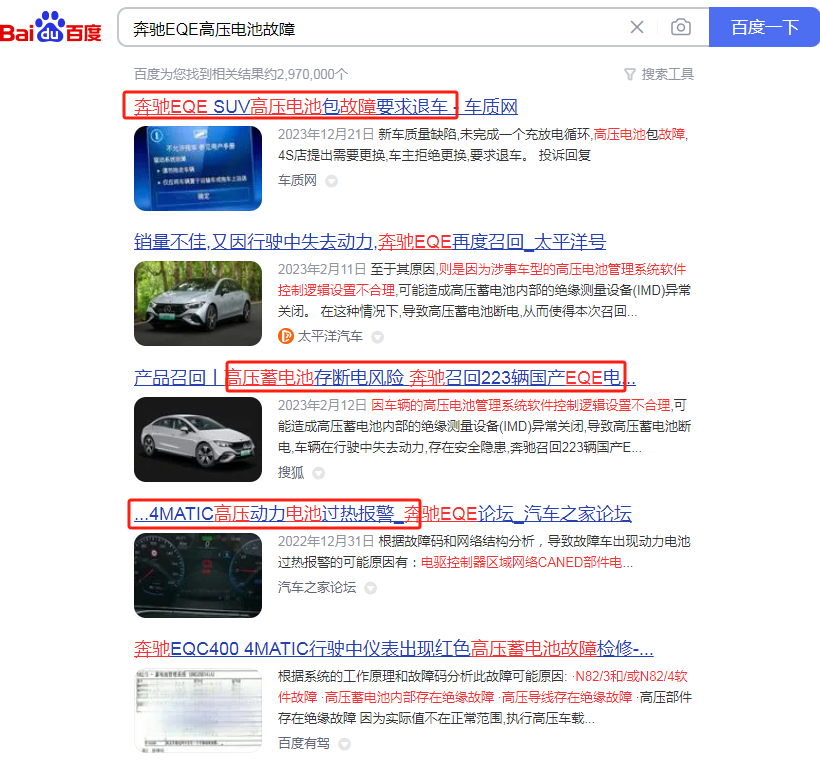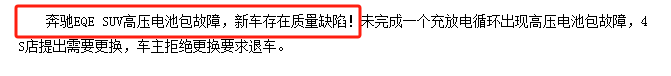 为了进一步了解车主胡女士反映的问题,小编也在网络上进行了相关搜索,发现有不少EQE车主曾反映高压电池故障。