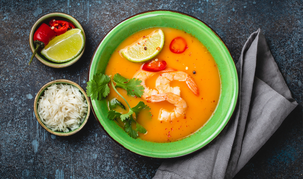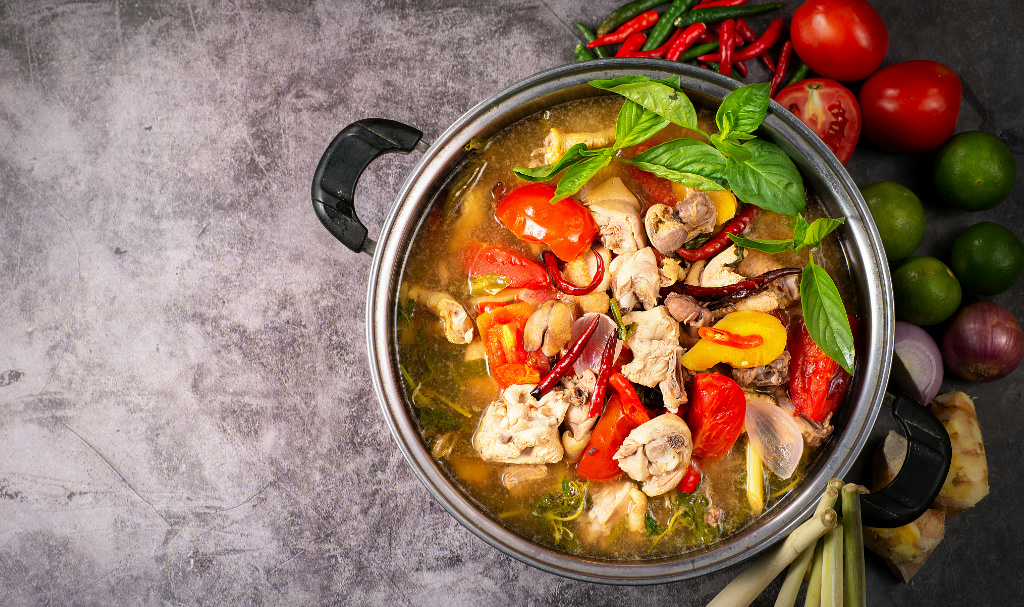 泰式料理在食材选择上极为丰富,大量运用蔬菜、水果、海鲜等,以青柠、酸柑等天然酸性成分取代传统的醋,而富含氨基酸的鱼露则提供了类似酱油或盐的咸鲜味。其他香料如香茅、南姜等,不仅增添风味,本身也具有药用价值。泰式料理的烹饪方式多以蒸、煮为主,这样的烹饪手法使得成菜呈现出清新健康的特质,恰好迎合了当下消费者对健康饮食的追求。