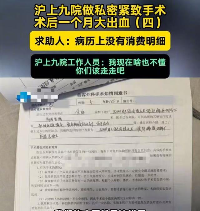 据求助人魏女士所说,她是一个多月前来到沪上九院做的私密紧致手术,结果一个月后下面开始大出血。