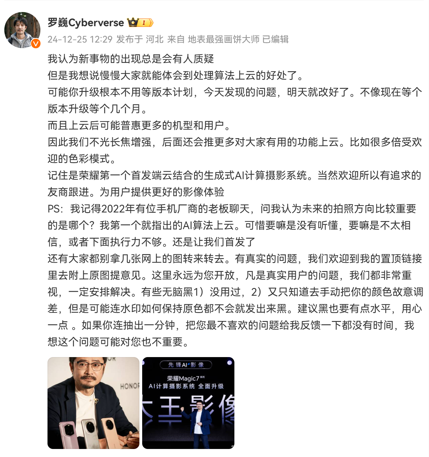 荣耀首席影像工程师罗巍强调了软硬件算法相辅相成的关系,指出:“AI是放大器,有机会把硬件能力放大100倍。”而算法上云,既能够在云端实现快速的进化更新,又能够使用户免受机型限制,体验更新、更多的影像功能。