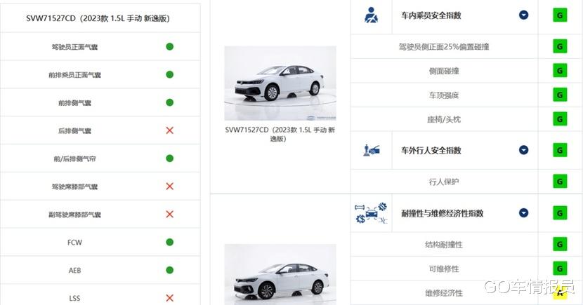 本轮8台车当中,只有朗逸新锐拿到了G,毕竟这车的功能性配置偏少,前面没有雷达什么的,修起来不贵,可以理解。