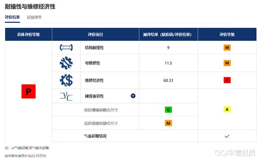 这部分主要是体现在发生轻微碰撞后,是否方便维修,以及修起来贵不贵。对于保险行业,这部分是整个测试中最具有意义的环节。其实和咱们消费者也有直接的关系。有些车主不买车损,那这个评价就可以拿来参考,看看修车贵不贵。更多的车主应该是会买车损险的,那保费就有可能和这一评价挂钩。