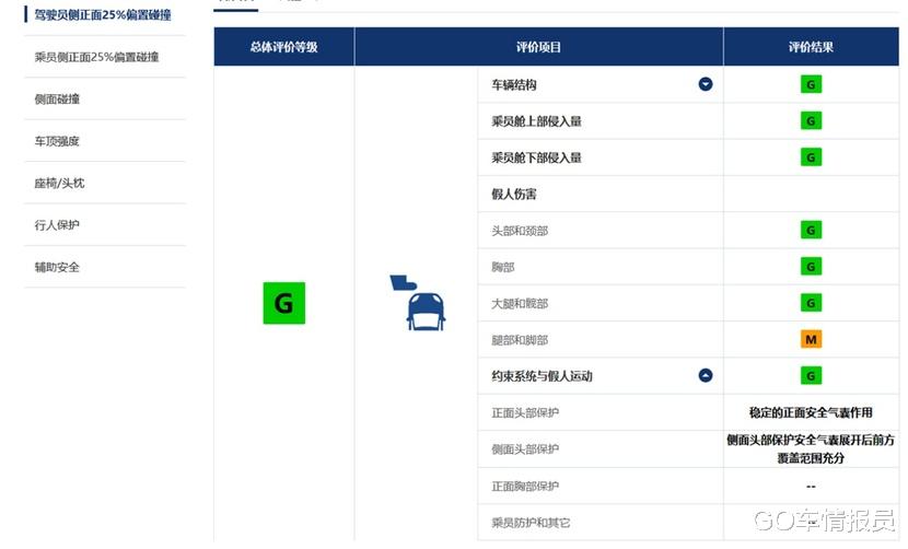 但要说没有任何看点也不至于,综合评分G,不代表大家都是一样的优秀。展开来看细节,不是有所车每个项目都是G的。比如智己LS7在主驾驶侧偏置碰撞时,假人的腿部和脚部就只拿到了M;精灵3的侧碰,驾驶员躯干拿到了A。