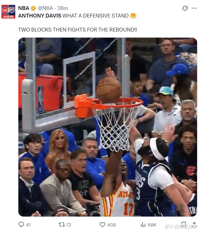 末节,老鹰开始采取包夹浓眉的战术了,浓眉出球后队友的把握不高,来一波23-14完成反超,最关键的一球,终场前3秒,浓眉持球抛投准绝杀,特雷杨三分面对浓眉不中,独行侠拿下胜利浓眉一攻一防尽显统治力,末节6分4篮板1助攻1盖帽。