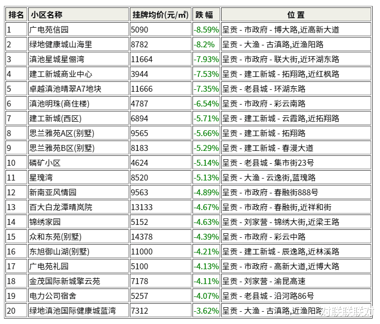 昆明呈贡二手房本月涨幅最大的小区排行1、果林溪谷花园:9909元/㎡,上涨+6.92%,位置:呈贡 - 建工新城 - 林溪路26号