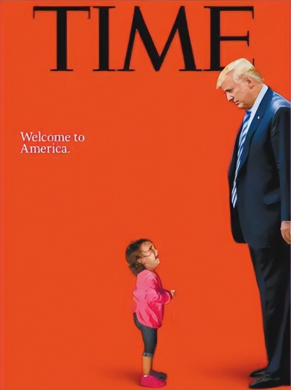 当时时代周刊还专门出了一期封面,剑指特朗普的骨肉分离计划,上面画着特朗普居高临下的冷漠的看着一个哭泣而无助的移民小女孩,情绪价值拉满........