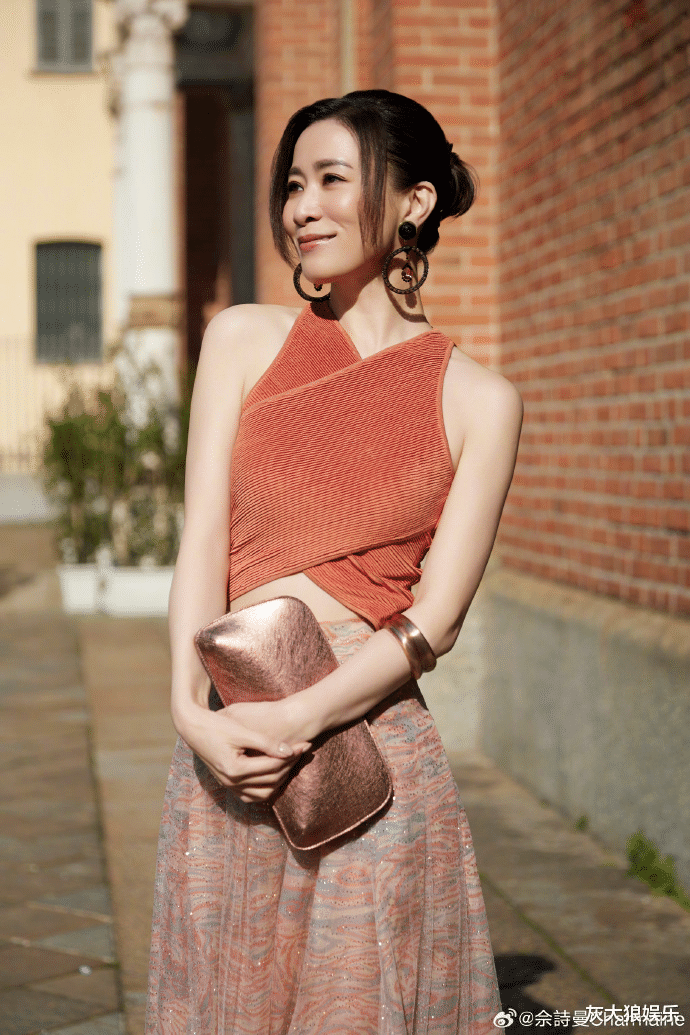 一亮相,佘诗曼就选了一件橙红色挂脖背心,搭配刺绣纱裙,这颜色简直太亮眼了。