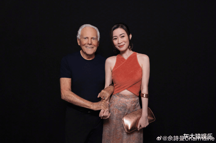 到了秀场,佘诗曼和阿玛尼老总挽手合影,笑容那叫一个甜美。