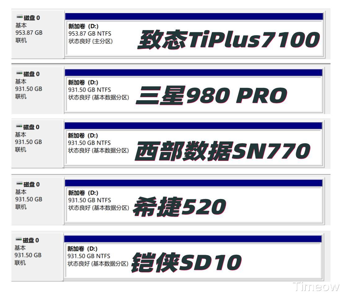 格式化后,致态TiPlus7100的实际容量最多,为953.87GB,而其余四款实际容量皆为931.5GB,虽然931.5GB符合1TB SSD的惯例,但致态TiPlus7100的实际容量略大一些,个人对此表示对致态会更有好感一些。
