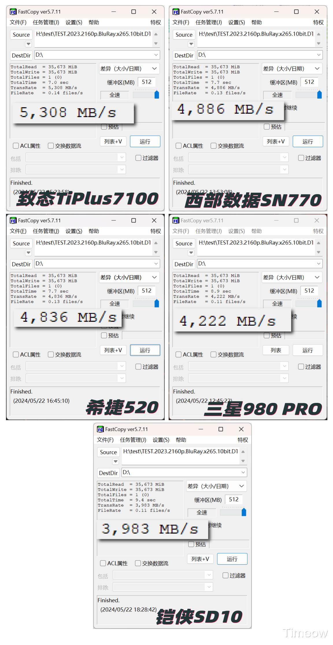 使用FastCopy,从我电脑的宏碁掠夺者SSD上读取,将一个35GB大小的视频文件,分别写入到五个盘内,平均写入速度如下↓