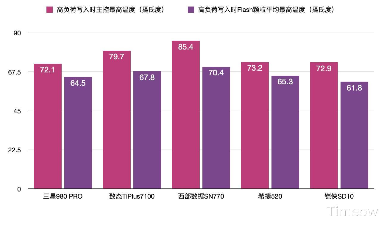 图中可见,读速处于5000MB/s档的西部数据SN770,自身发热是最严重的,主控芯片和闪存颗粒的最高温达到了85.4℃和70.4℃。
