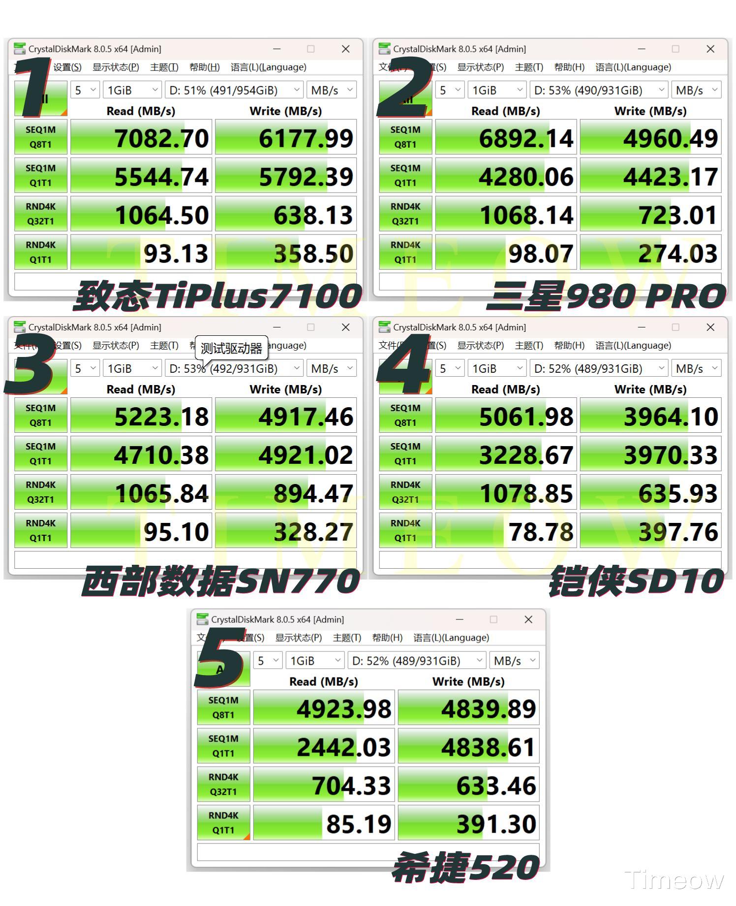 这个测试项目中,表现最佳的是致态TiPlus7100,写入速度达到了5308MB/s。